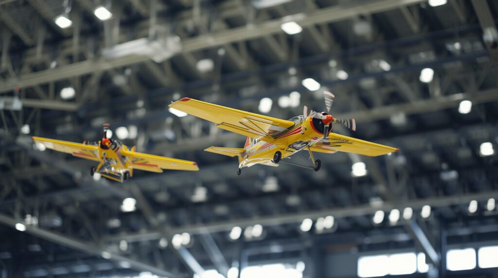Beim RC-Fliegen in der Halle – auch „Indoor-Fliegen“ genannt – werden besonders leichte und wendige Modelle eingesetzt. Typisch sind sogenannte Shockflyer, Slowflyer,